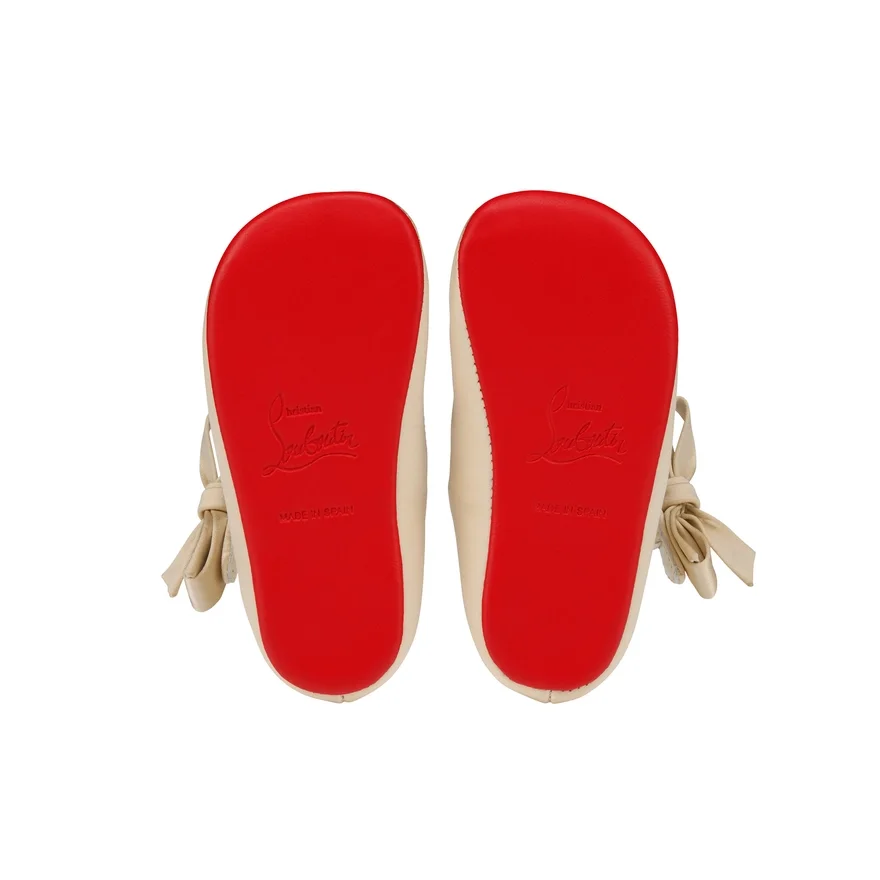 The Lou Babe Pram Shoe Features the Elegant Styling of Maison Christian Louboutin’s Women’s Shoes. It is Crafted in Beige Pastel Crepe Satin with White Lining. This Model Features a Loubi Red Leather Sole and a Bow on the Side.