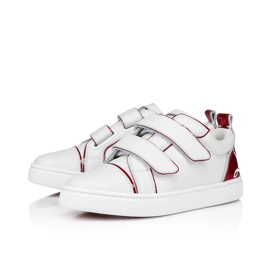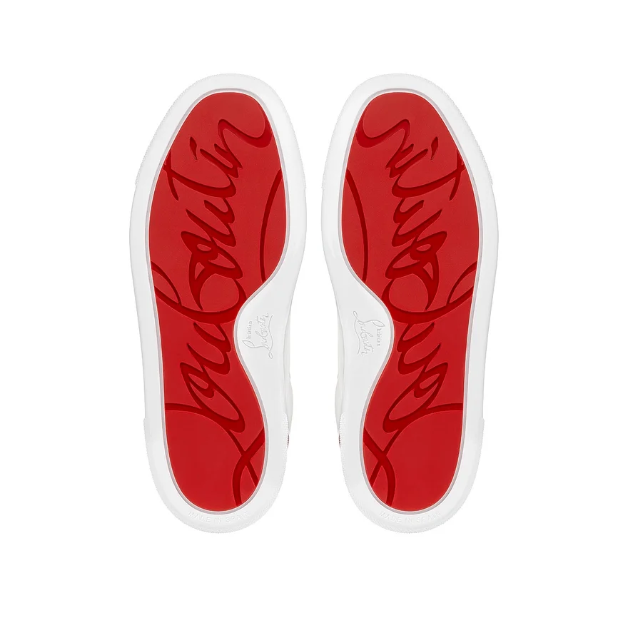 The Funnyto Scratch Low-Top Sneaker Showcases Sleek Lines. This Sporty Maison Christian Louboutin Model is Crafted in White Calf Leather and Patent Psychic, Loubi Red Iridescent Calf Leather.