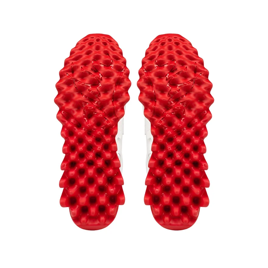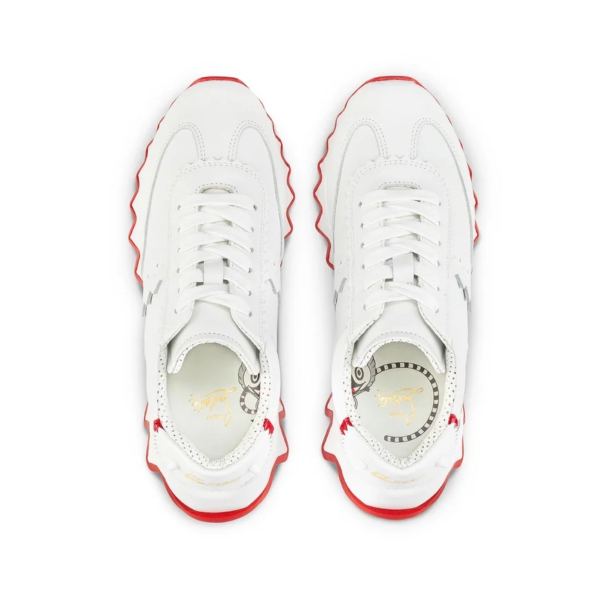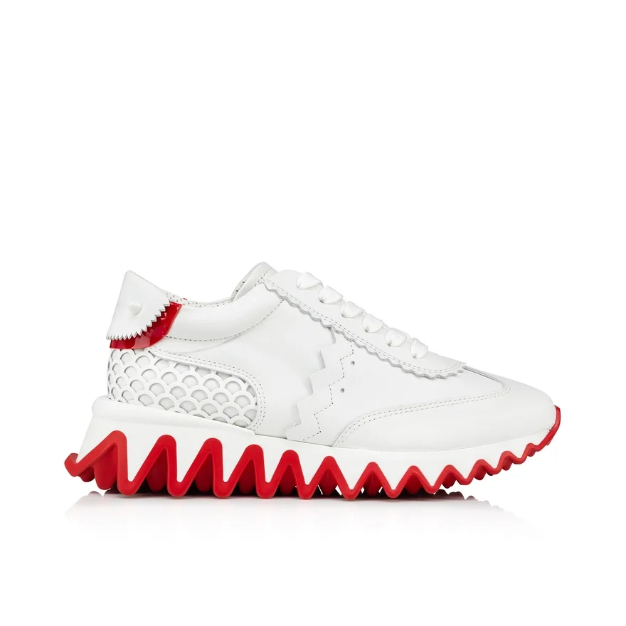The Mini Shark Sneaker Reworks the Codes of Maison Louboutins Iconic Loubishark with Its Signature Blend of Textures. It Has a Two-Color Rubber Sole Evoking Sharks’ Teeth and is Dressed White Calf Leather and Matching White Rubber. The Back is Adorned with the Signature White Spikes.