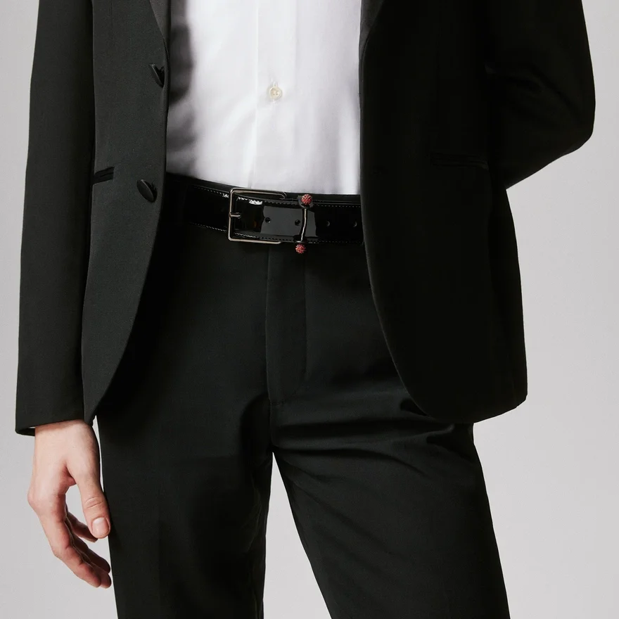 The Timeless Chambeliss Night Strass Belt Captivates with Elegant Style. This Maison Christian Louboutin Model is Crafted in Black Patent Calf Leather. Forming Part of the Special Valentine’s Day Collection, It Features a Signature Collar Pin Covered with Red Velvet Strasss.