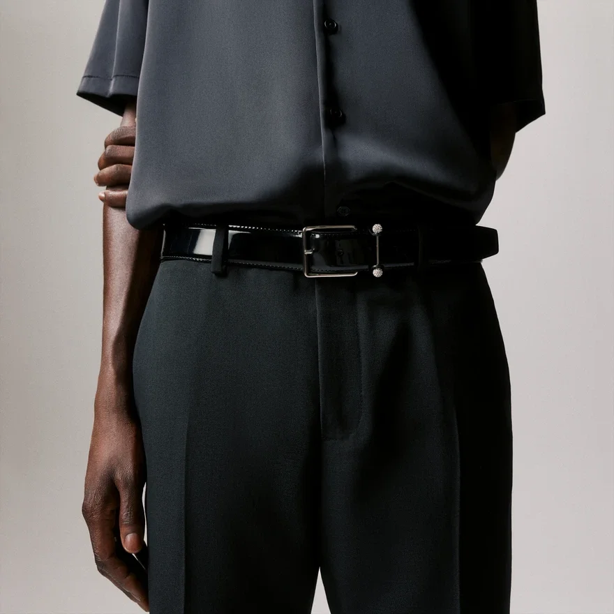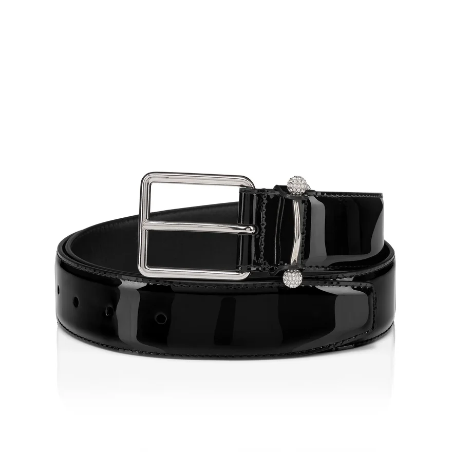 The Timeless Chambeliss Belt Captivates with Elegant Style. This Maison Christian Louboutin Model is Crafted from Black Patent Leather. It Has a Square Buckle and Features a Horizontal Silver Strass Collar Pin.