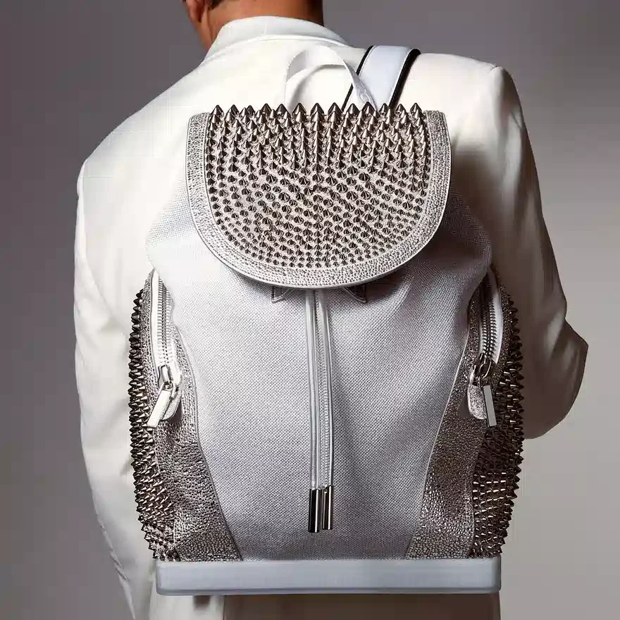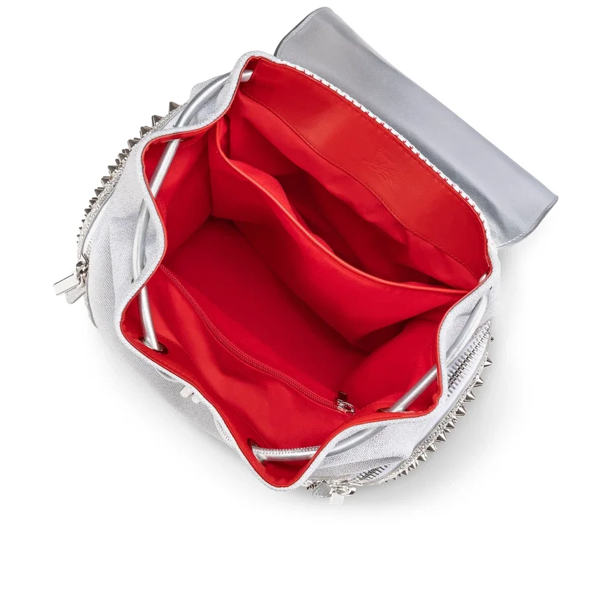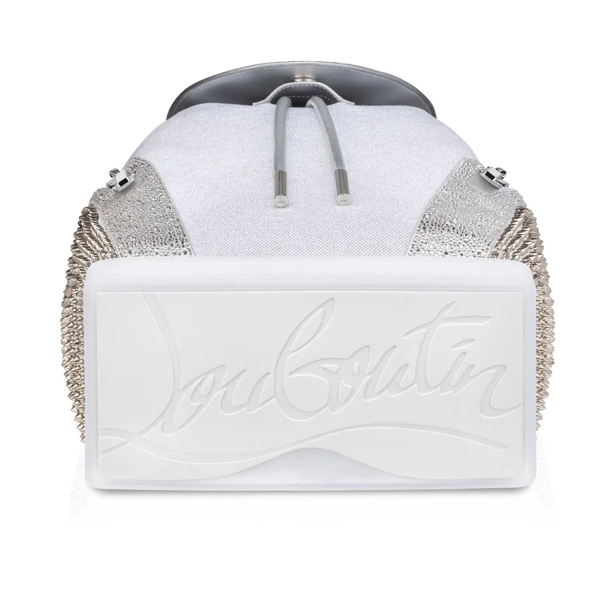 The Urban Explorafunk Backpack in Size Small Features Sporty Lines and a Maison Christian Louboutin Signature. This Model in White and Silver Combines Calf Leather Glitter and Suede and is Adorned with Signature White Spikes.