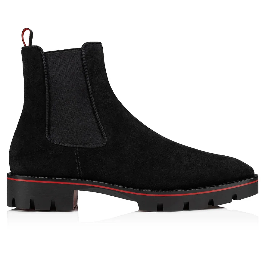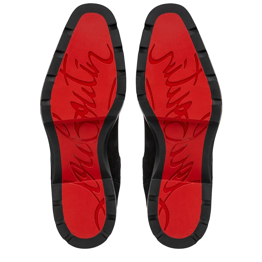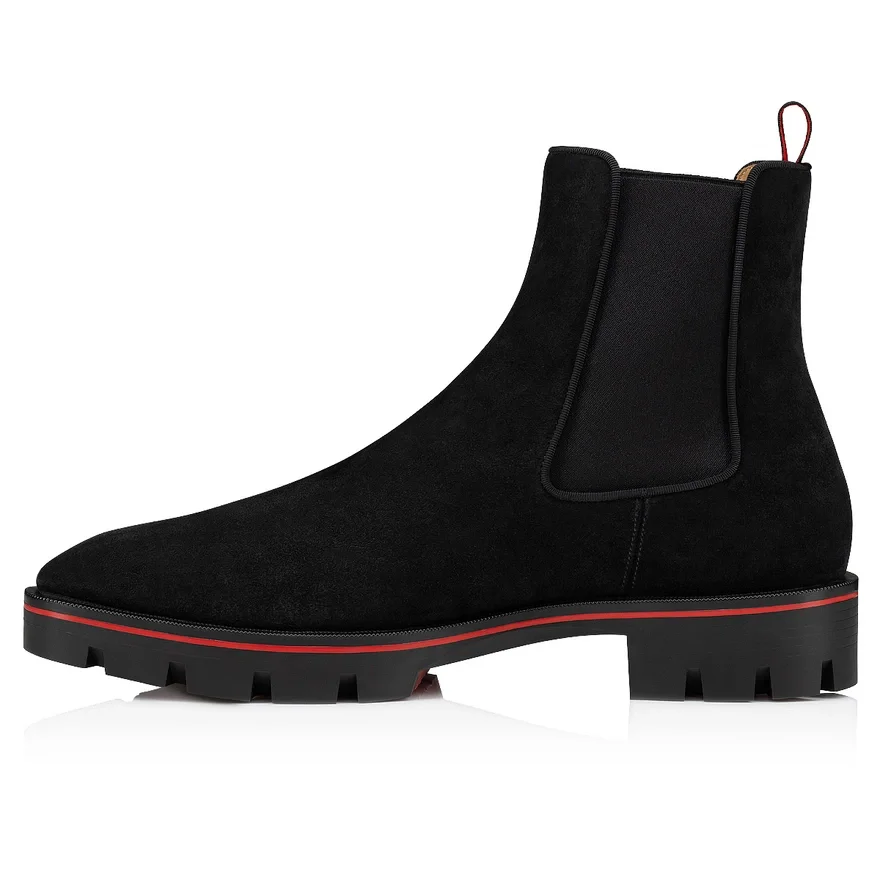 The Alpinosol Boot by Maison Christian Louboutin Combines Sleek Elegance with a Hiking Boot for a Smart Style That is Practical and Easy to Wear. Crafted in Soft Black Calf Leather, This Boot Sits on a Rubber Lug Sole Outlined with Signature Loubi Red. It Features Elasticated Panels at the Side Outline with a Couture Grosgrain Ribbon Trim. A Heel Tab Makes It Easy to Pull On.