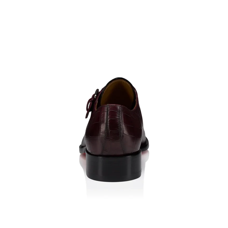 The Chambelimonk Monk Shoe is Characterized by Its Refined Design. Crafted from Amara Burgundy Alligator-Embossed Calf Leather with a Patinated Effect Handcrafted on the Upper, This Maison Christian Louboutin Shoe Features an Adjustable Buckled Side Strap. It is Characterized by a Transverse Metallic Collar Pin for an Audacious Look.