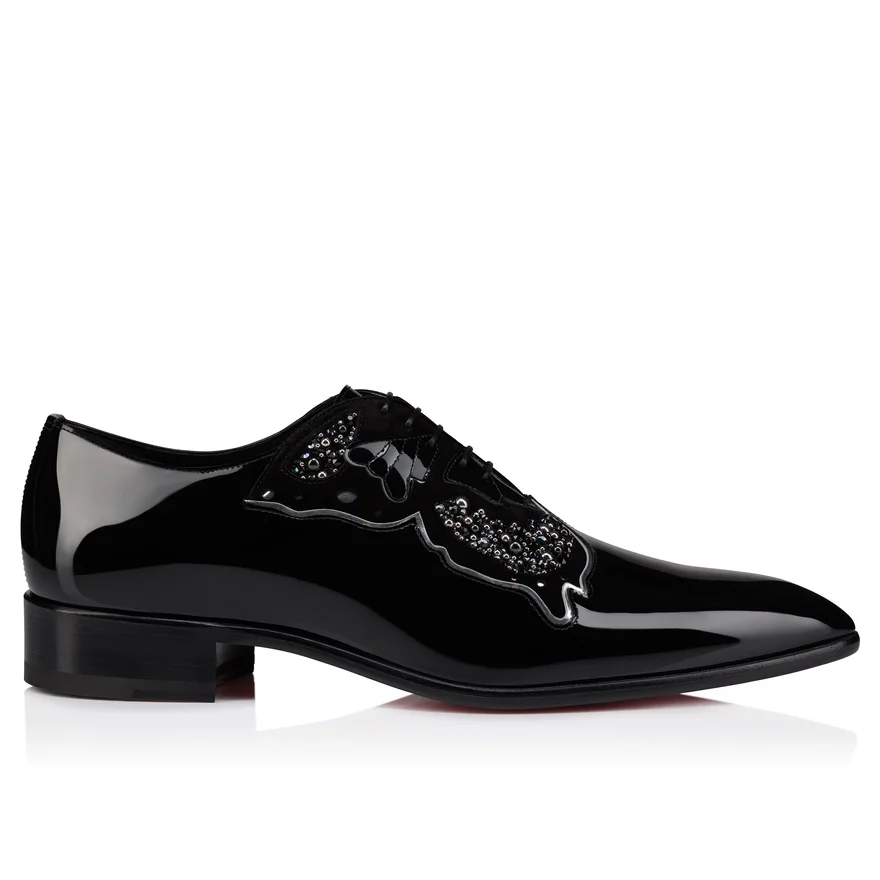 With Its Tapered Silhouette and Pointed Toe, the Farfarock Shoe is Both Elegant and Innovative. Set on an Understated Heel, It is Made from Black Patent Calf Leather. The Veau Velours Upper Panel Detailing Showcases Maison Christian Louboutin’s Expertise. It is Outlined in Specchio Calf Leather and Patent Calf Leather and Embellished with Hand-Assembled Rhinestones to Depict a Butterfly. This Shoe is Part of the Hollywood Capsule.