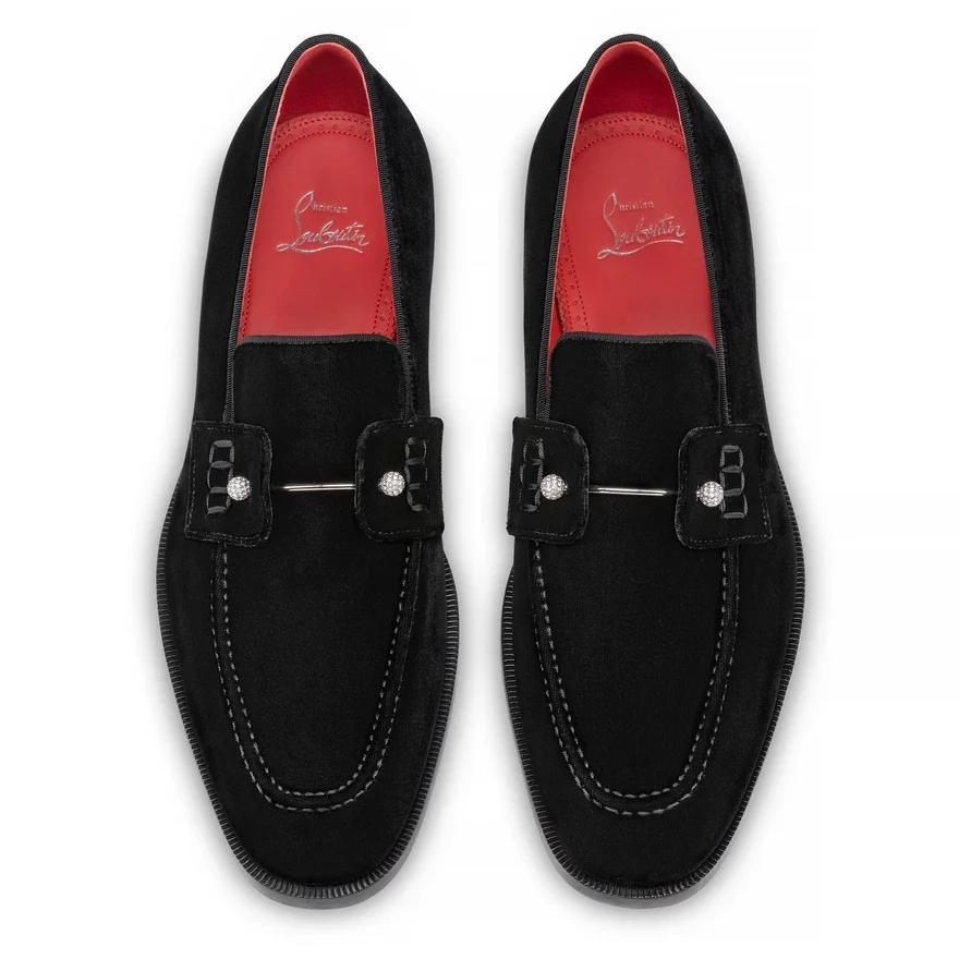 The Chambelimoc Night Strass Loafer Enchants with Its Refined Design. Crafted from Black Velvet, This Model Testifies to the ‘Savoir-Faire’ of Maison Christian Louboutin. This Elegant Shoe is Distinguished by Its Side Straps Joined by a Silver and Strass Collar Pin for Audacious Style.