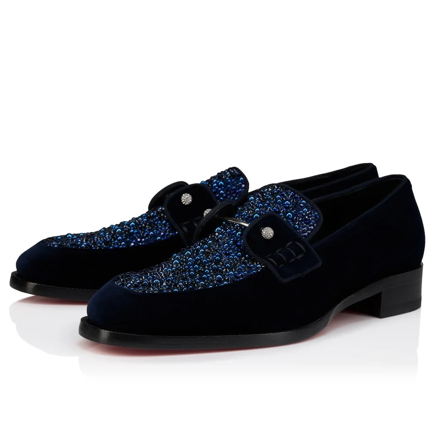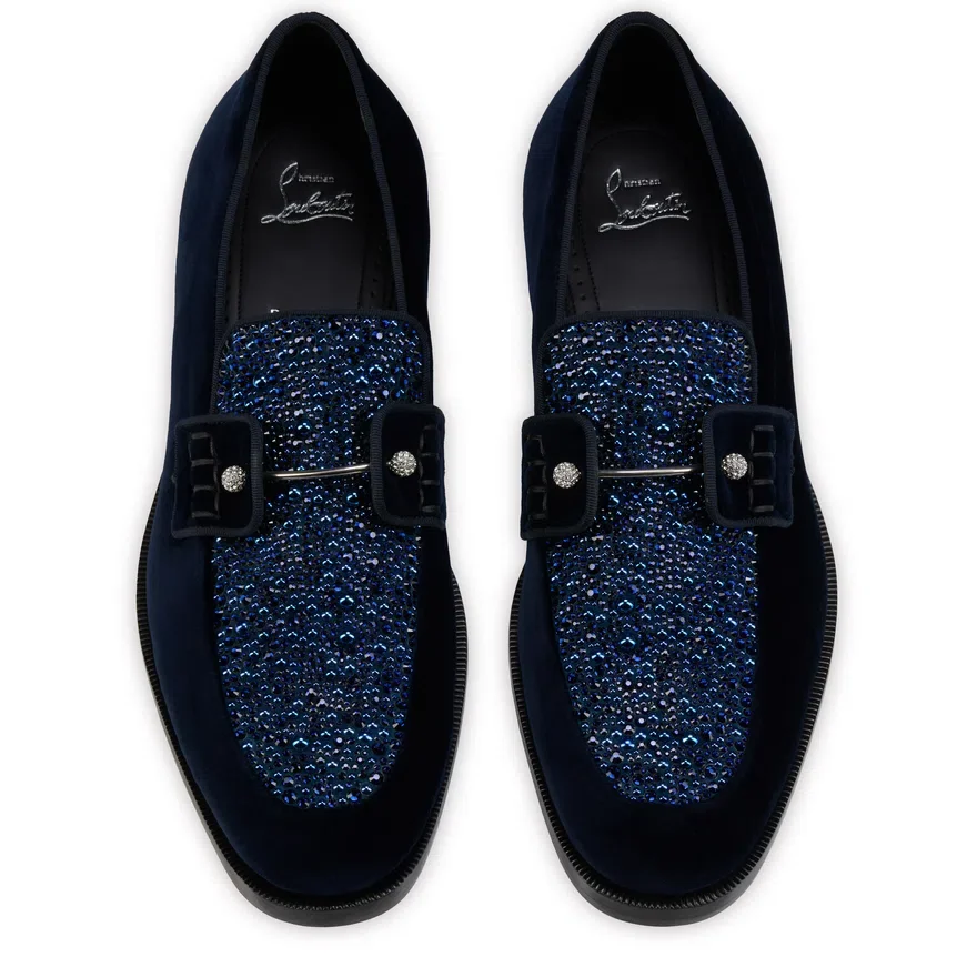 The Chambelimoc Loafer Offers a Sleek Design. This Maison Christian Louboutin Model is Crafted in Last Night Blue Velvet and Veau Velours, Which is Adorned with Strass and Pearls. It is an Elegant Shoe Featuring Side Straps Joined by an Audacious Silver Collar Pin.