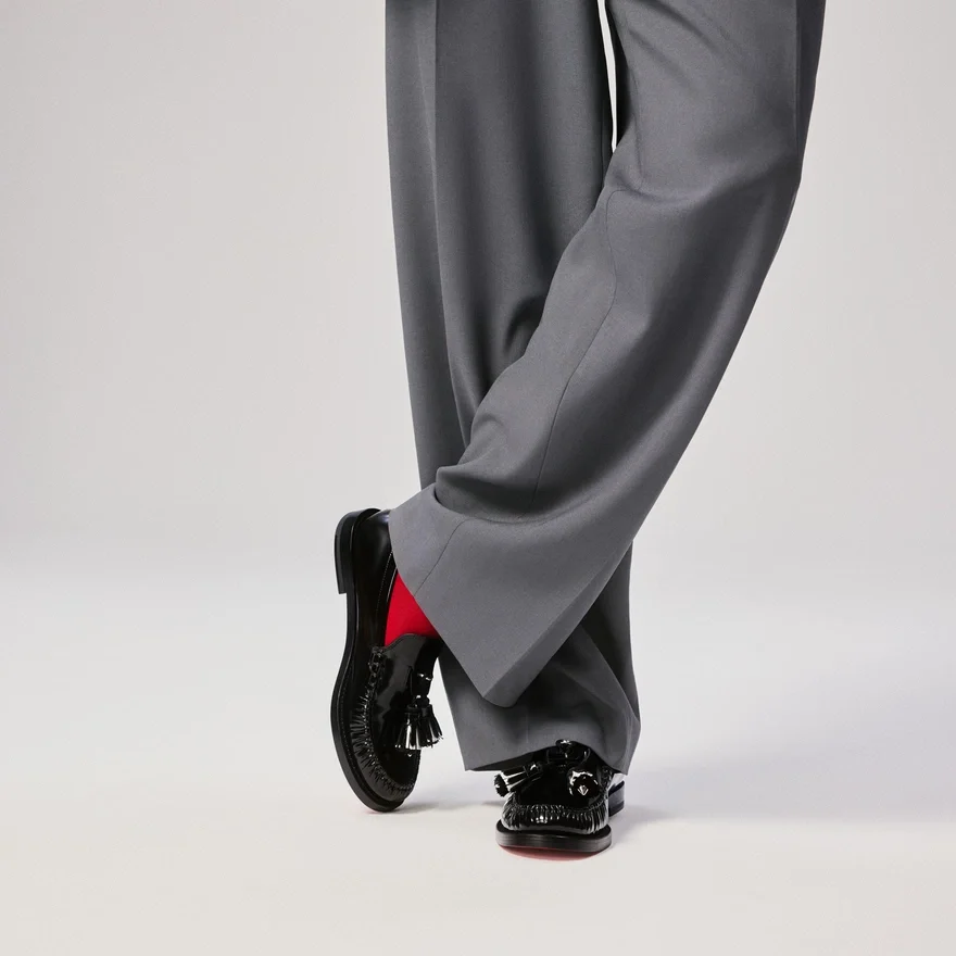 The Timeless Orlando Loafer is Partially Hand-Stitched and Adorned with Two Distinctive Leather and Textile Tassels, Each Decorated with a Spike. Crafted in Black, Slightly Shiny Calf Leather, This Model Features the Iconic Loubi Red Sole, the Embodiment of Maison Christian Louboutin Sophistication.