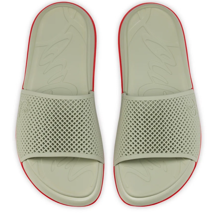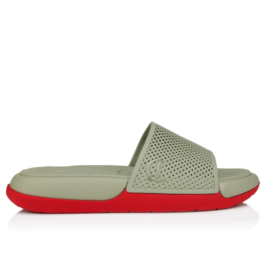 The Easy Breezy is a Refined Summer Mule That Offers Effortless Chic. This Model in Haiiro Green is Crafted from Rubber, Sits on a Bold, Cushioned Loubi Red Sole, and Features the Cl Mooncrest Logo on the Banner and a Louboutin Signature on the Footbed.