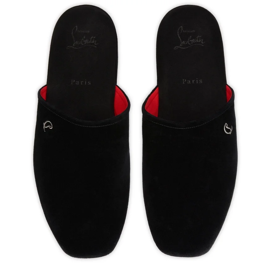 Combining Black Velvet and Black Suede, the Tonton Dede Slipper by Maison Christian Louboutin is a Statement of Sophistication. It Features a Lightweight Microfiber Sole in Loubi Red. This Model is an Online Exclusive.