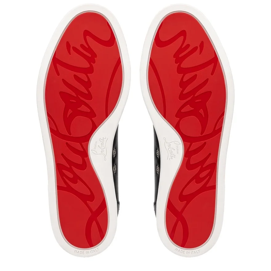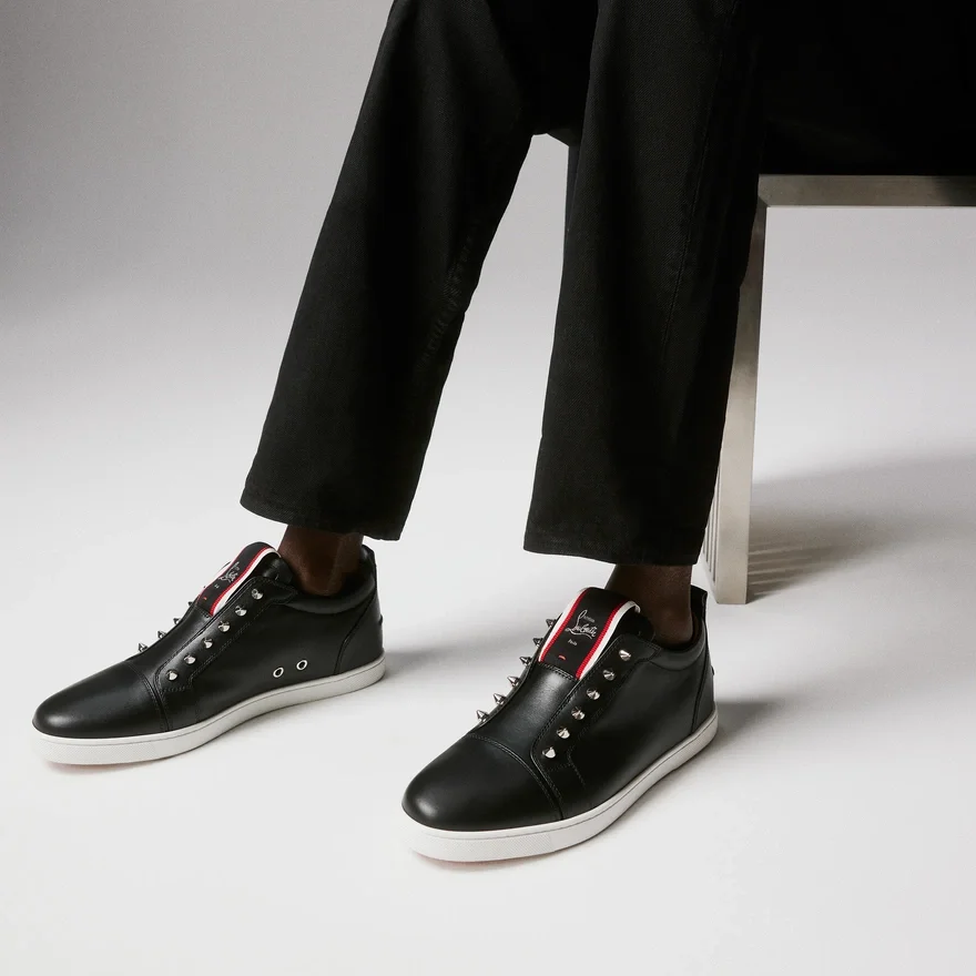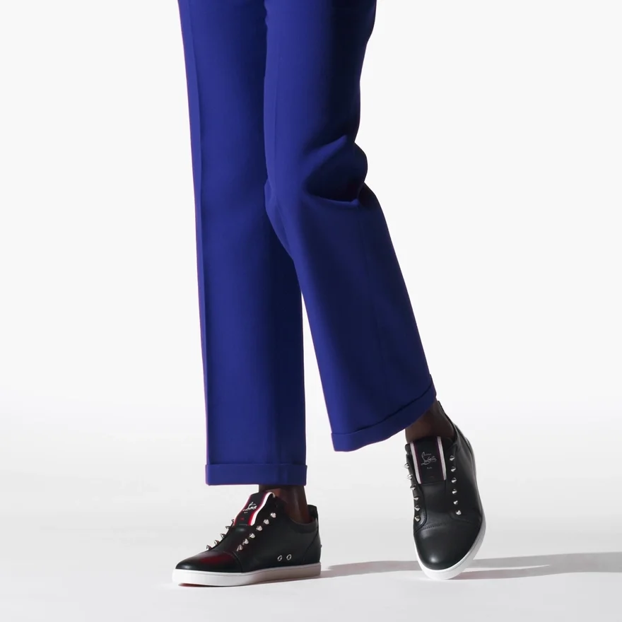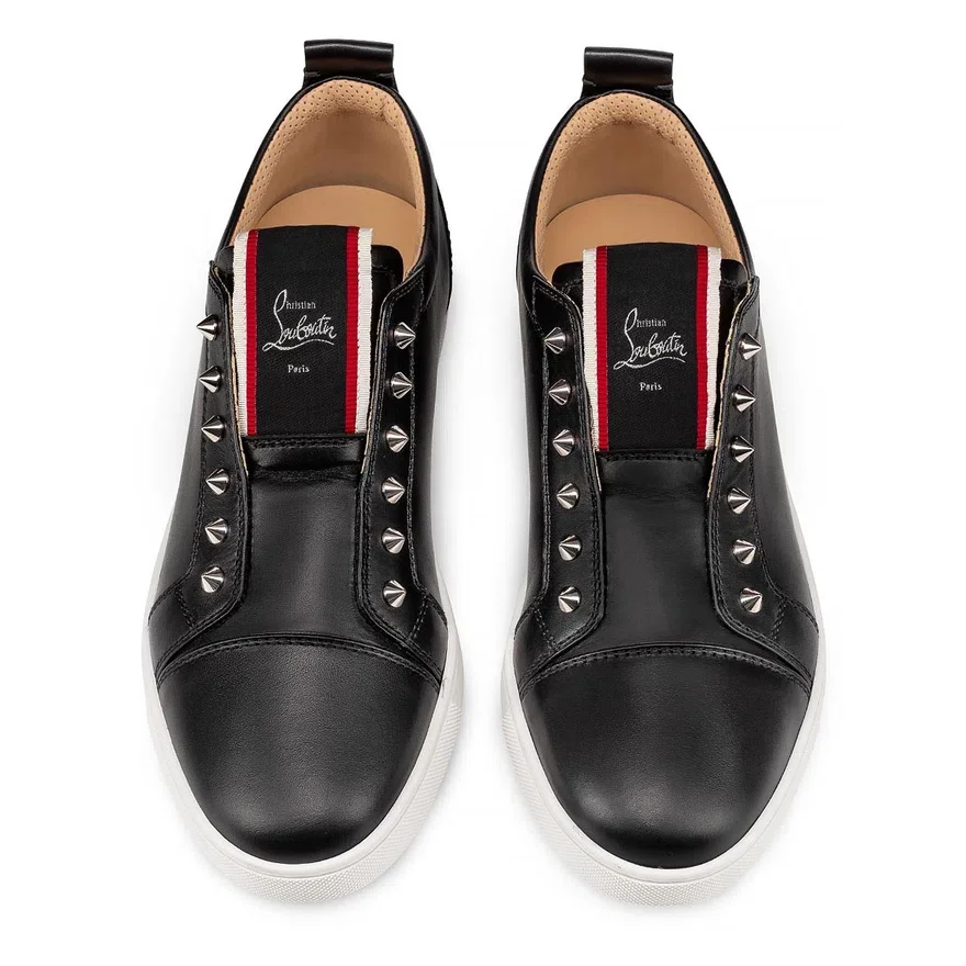 The F.A.V. Fique a Vontarde Sneaker Gives a Modern Twist to a 1980S Tennis Shoe, with a Slip-On Style and Signature Maison Christian Louboutin Details. An Iconic Grosgrain Fav Label Adorns the Tongue of Each Sneaker. This Model is Crafted in Classic Black Calfskin Leather for Timeless Appeal with a Row of Iconic Glossy Silver Spikes Running Each Side of the Tongue.