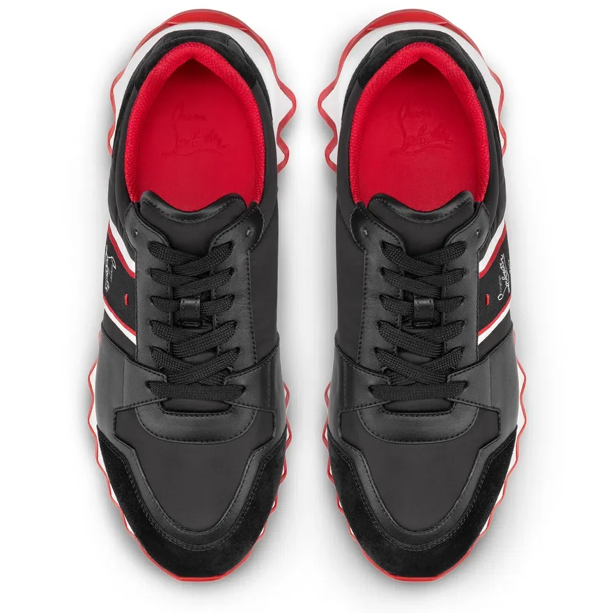 The Nastroshark Trainer’s Audacious Style Exhibits a Combination of Textures. Set on a Two-Tone Rubber Sole Reminiscent of a Shark’s Teeth, This Black Model is Crafted from Crosta Leather, Calf Leather and Nylon. A Louboutin Signature Adorns the Side While the Tongue Exhibits a Three-Colour Ribbon.