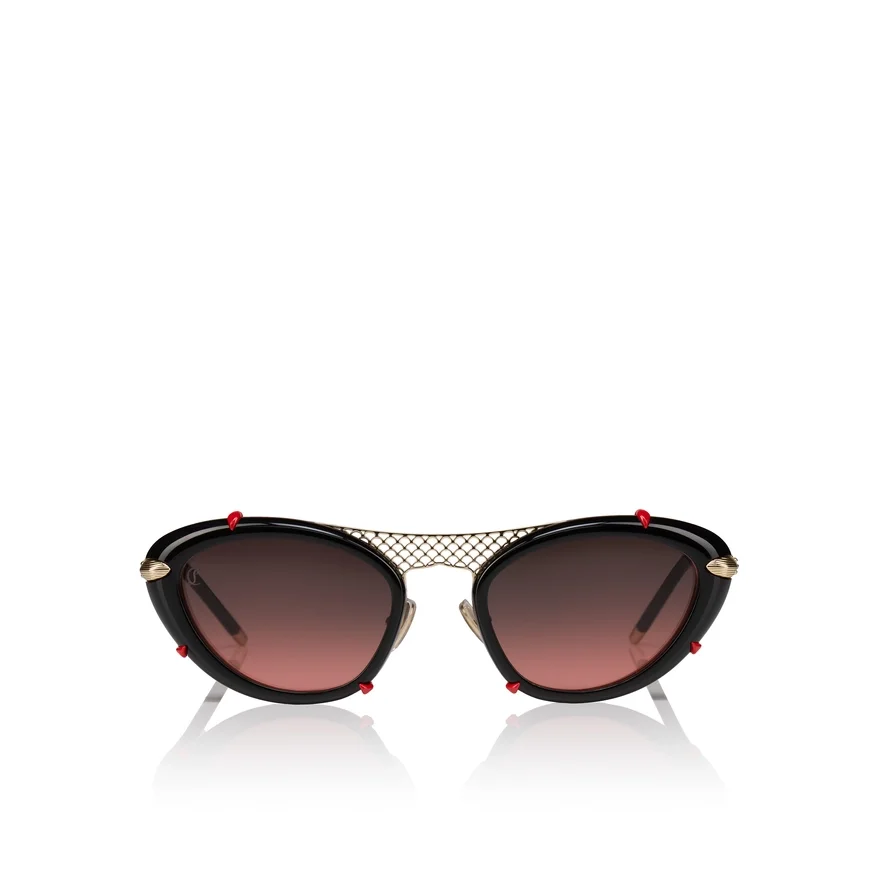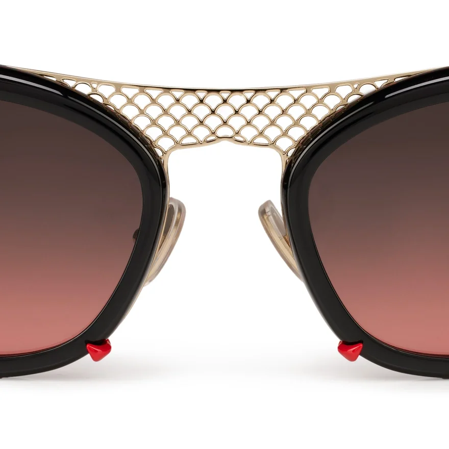 Dolly Lb0001 is One of the Most Iconic Styles of This Sunglasses Collection. Oval Shape with Palmette Pattern Crafted Metal in the Internal Part of the Frontal Grabbed to the Acetate Profile with Tiny Metal Red Sole. Art Deco Inspired Temples with Palm Detail on the Hinge.This Model is Made in a Black Color and Pale Gold with Smoke Gradient Red Lenses. High-Performance Zeiss Lenses Offering Exceptional Quality Comfort and Durability in an Exclusive Color Made Only for Christian Louboutin Collection.
