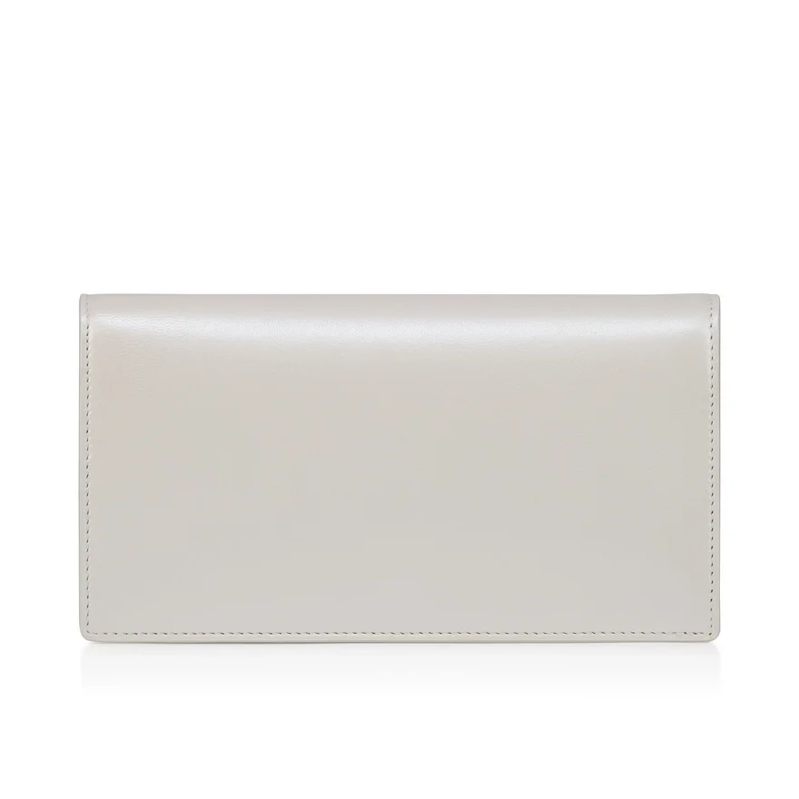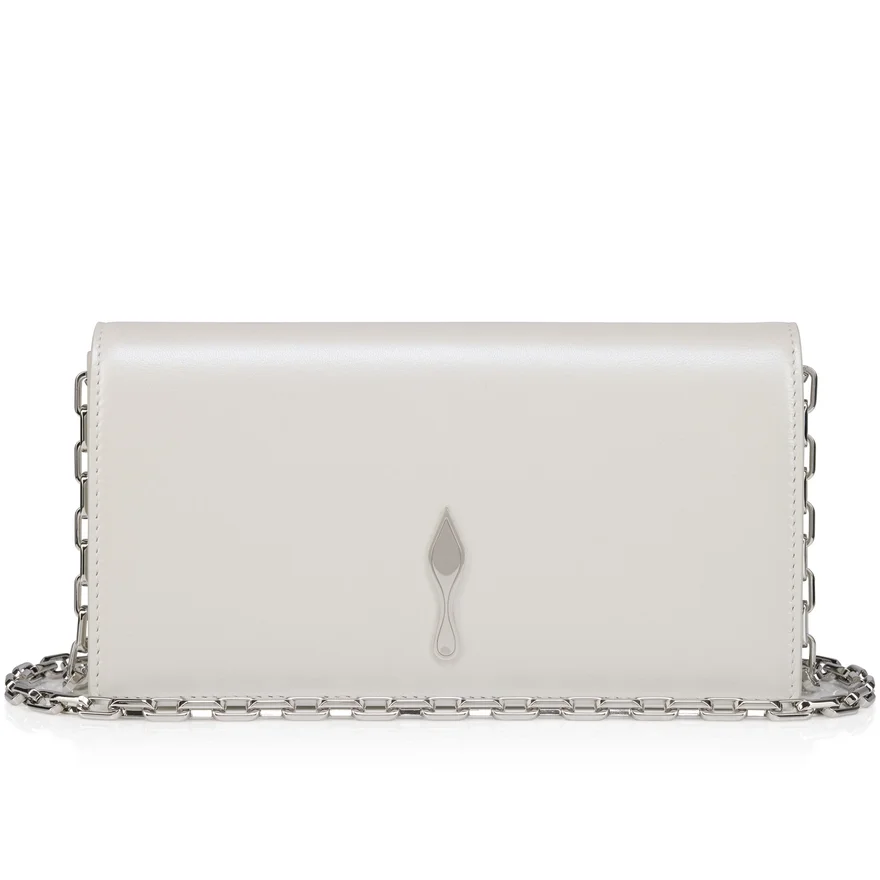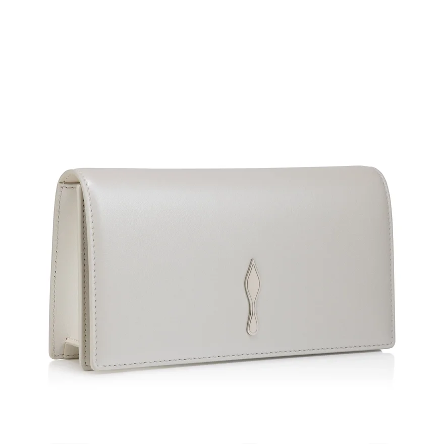 The Sophisticated Bettina Clutch Features a Silver Embellishment on the Front, Evoking the Silhouette of the Iconic Sole. This Signature Model from Maison Christian Louboutin is Entirely Crafted in White Pearlescent Lamb Nappa Leather and is Part of the Wedding Capsule, Offering Sleek Elegance. The Leather Reflects the Light and Evokes the Texture of a Pearl.