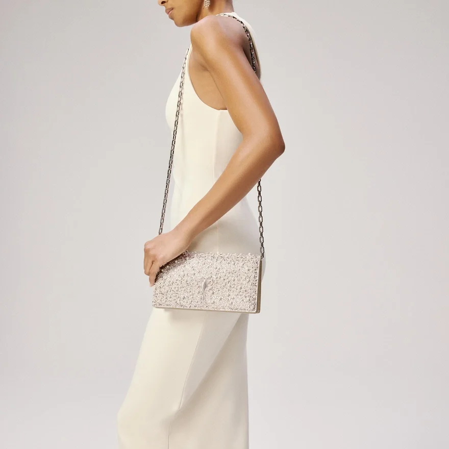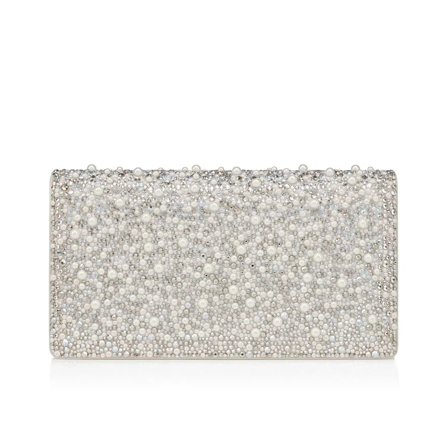 The Sophisticated Bettina Clutch Features a Silver Embellishment on the Front, Evoking the Silhouette of the Iconic Sole. This Signature Model from Maison Christian Louboutin is Crafted in Black Suede Calf Leather and Enhanced with 3,896 Strass and 1,754 Pearls for a Striking Result Ideal for Nights Out.