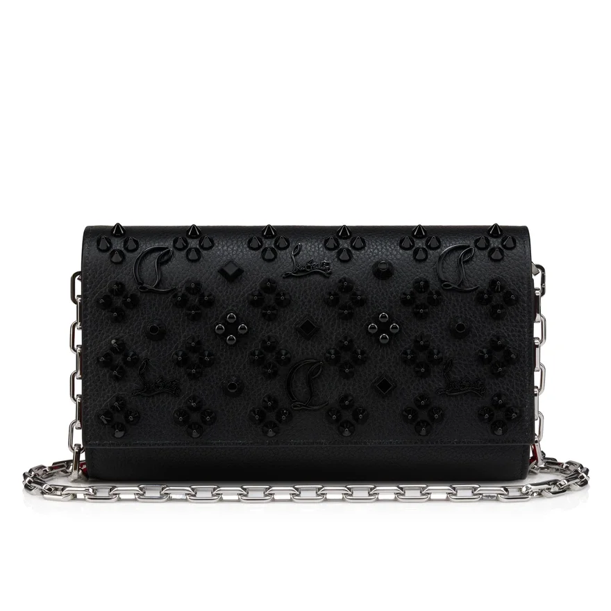 The Paloma Wallet on a Chain is Embellished with Spikes Representing the Emblematic Loubinthesky Motif. The Loubinthesky is a Unique Maison Christian Louboutin Ornament Combining Gun Metal Grey Spikes with the Maison’s Logo and Signature. Crafted in Grained Empire Calf Leather and Featuring an Over-The-Body Chain, This Wallet Comes in Black.