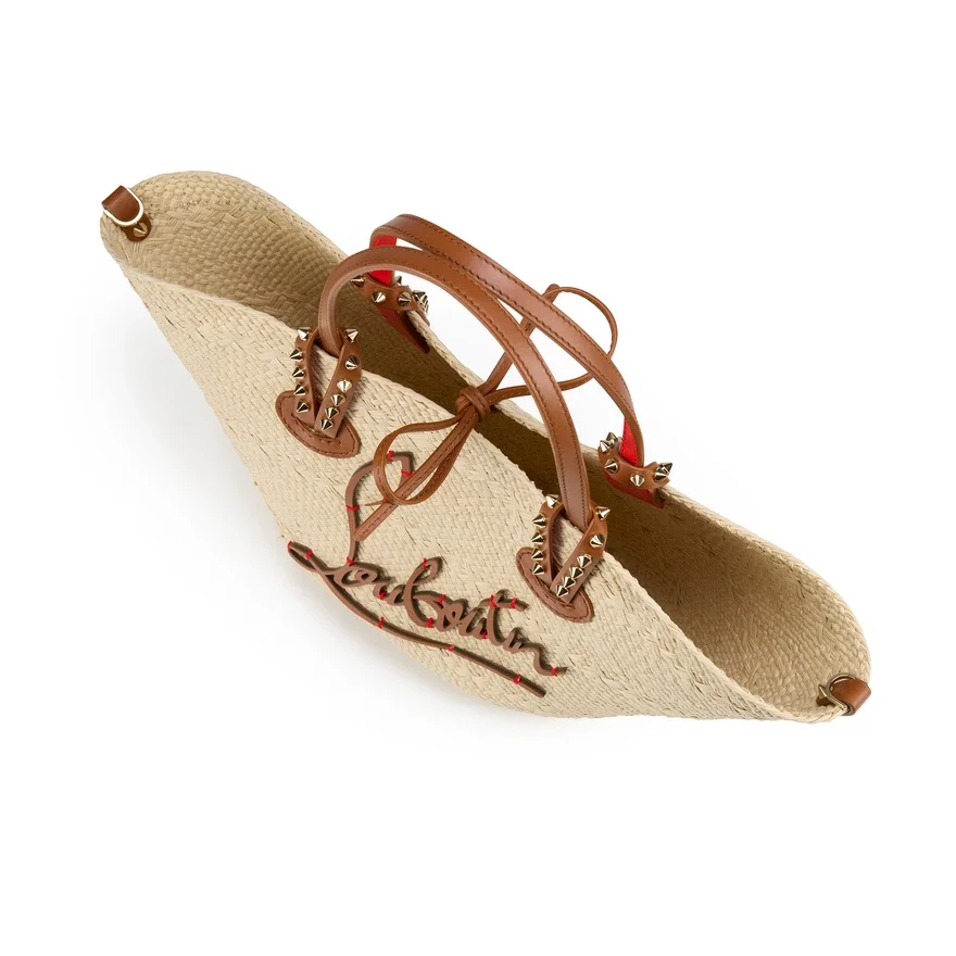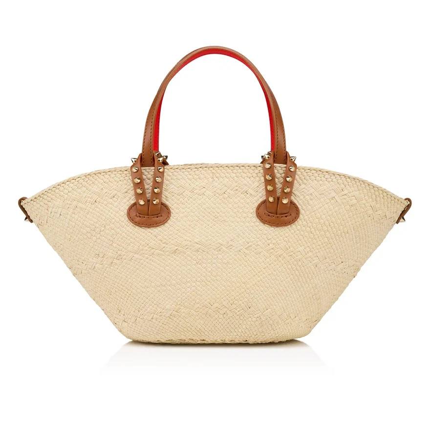 The Urban Cabata Bag in Size Mini is Adorned with Maison Christian Louboutin Signature Metallic Spikes Around the Handles. Made Entirely from Natural Brown Raffia, It Features Louboutin’s Signature Paris Cuoio Brown Leather.