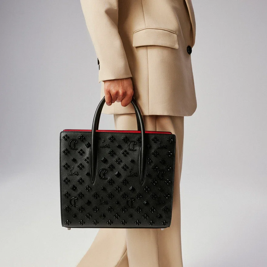 An Iconic Model of the Maison Christian Louboutin, the Paloma Handbag in Size Medium is Fashioned from Black Calfskin and Fully Saturated in Spikes and Tone-On-Tone Signature Monograms. Its Spacious Geometric Shape and Gusset Design Combine Elegance and Functionality.