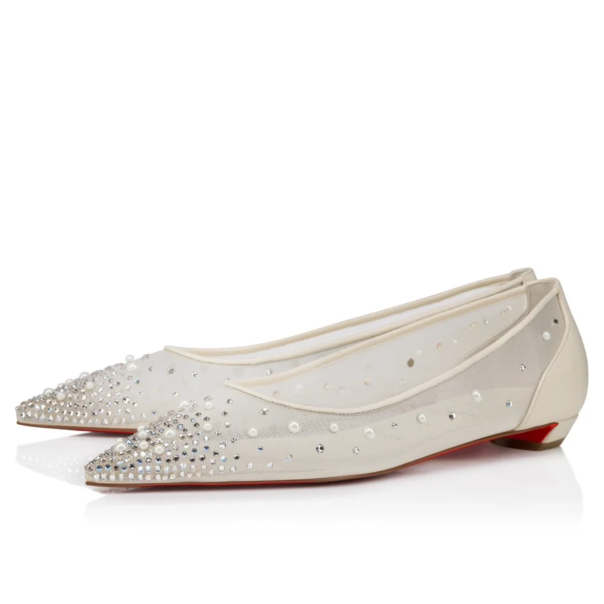 The Tapered Silhouette of the Miss Z Degrastrassina Perla Ballerina Ensures a Sophisticated Style. This Model from Maison Christian Louboutin is Crafted from Bianco White Mesh Outlined with Tonal Lamb Nappa Leather and Features a Padded Insole. The Mesh is Adorned with Hand-Placed Signature Strass and Pearls, Creating a Gradient Pattern Flowing from the Toe to the Heel. This Model Features an ‘Everlasting Red’ Sole Thanks to an Innovative Coating Technique to Ensure Resistance and Lasting Vibrancy for Our Signature Louboutin Red.