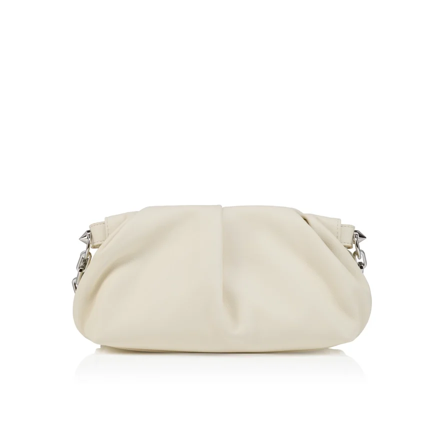 The Eva Shoulder Bag in Size Small Reflects Sophistication with Its Sleek Folds. Crafted from Lamb Nappa Leather in Suzuran White, It Features a Silver Charm Evocative of the Iconic Sole. This Sophisticated Maison Christian Louboutin Bag Can Be Carried by Hand or over the Shoulder Using the Silver Chain.