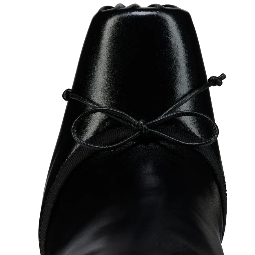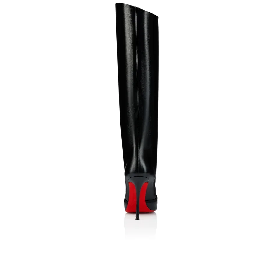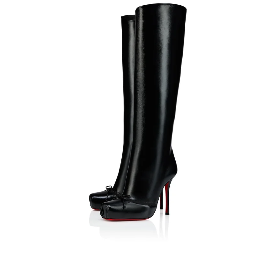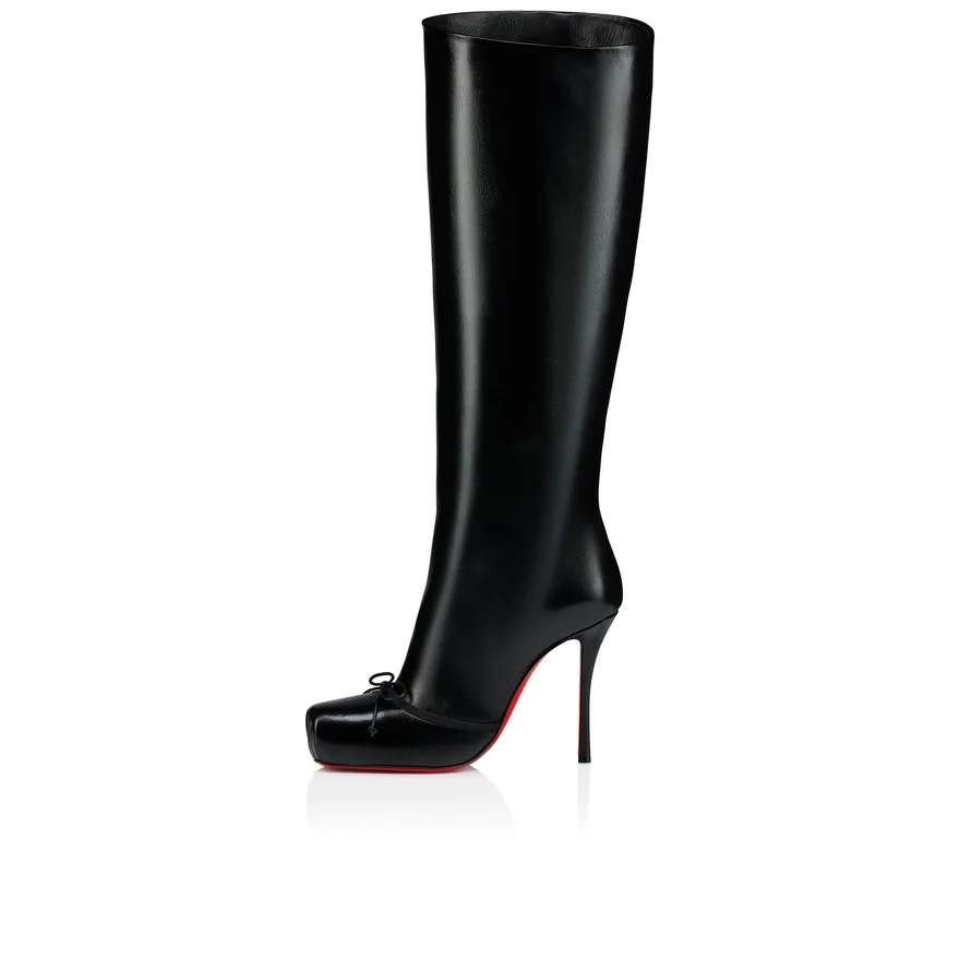 The Strikingly Elegant Cassia Nodo Botta Boot is Inspired by Ballet Shoes. This Maison Christian Louboutin Shoe is Crafted from Shiny Smooth Black Calf Leather and Set on a 100 Mm Curvy ‘Fetish’ Heel. The Upper Features a Seamless, Tubular Knee-High Boot Extending from the Shoe, and is Adorned with a Small Bow.