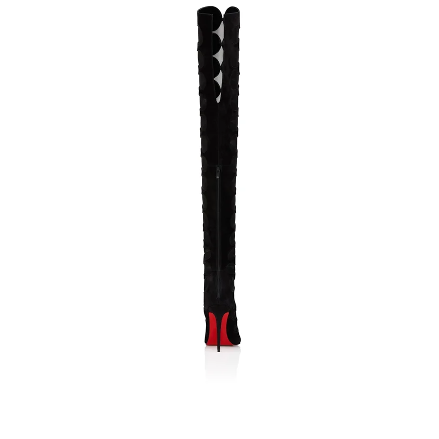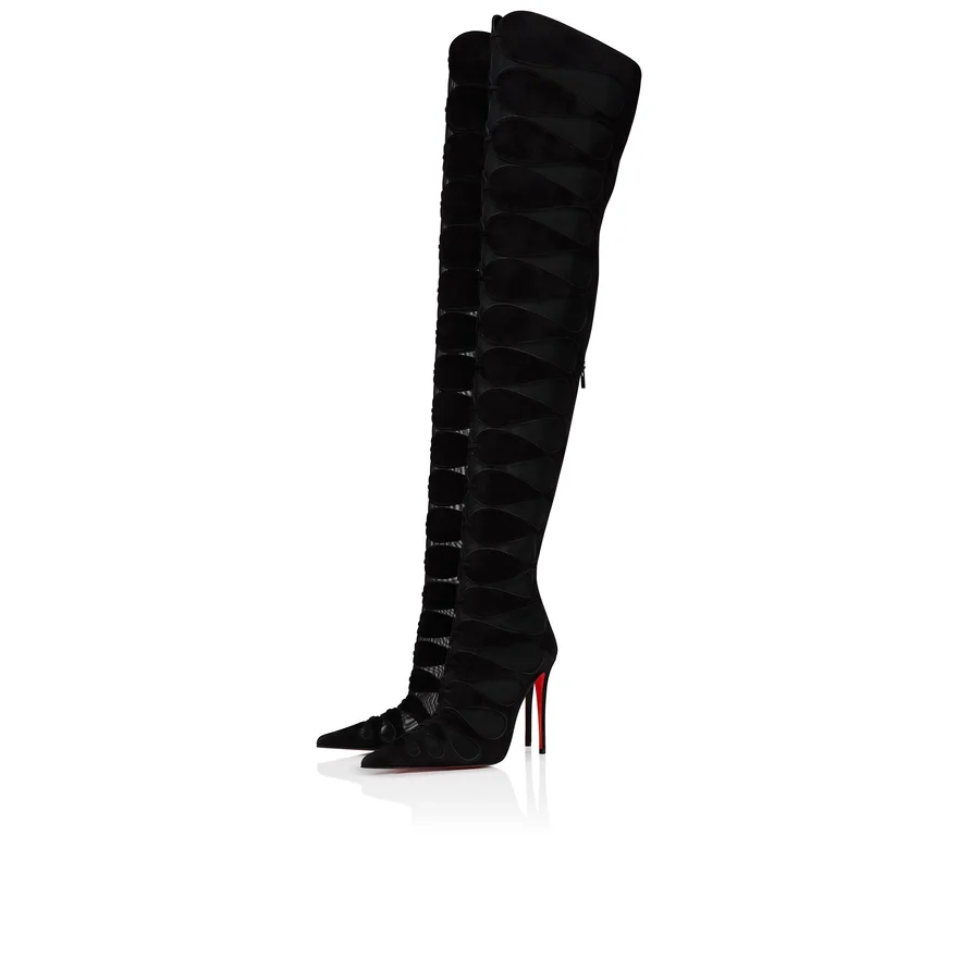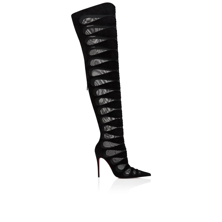 Maison Christian Louboutin’s Circus Max Botta Alta Blends Heritage Design with a Contemporary Appeal in a Thigh Boot with Sleek Lines. This Pointed-Toe Model is Set on a 100 Mm Stiletto Heel and Fastens at the Back with a Zip. It is Crafted in Black Veau Velours and See-Through Mesh and is Finished with Topstitching. This Model Features an ‘Everlasting Red’ Sole Thanks to an Innovative Coating Technique to Ensure Resistance and Lasting Vibrancy for Our Signature Louboutin Red.