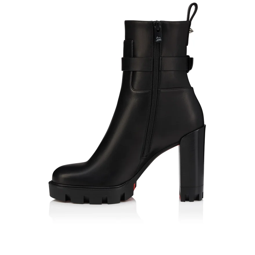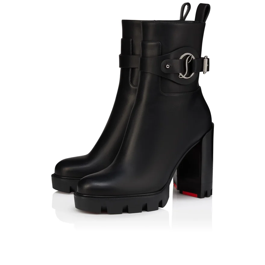 The Dianouchette Lug Ankle Boot Has a Modern Style. Crafted from Black Waxed Calf Leather, This Model Has a Lug Sole, Sits on a 100 Mm Block Heel and Features a Strap at the Back. It Features a Side Silver Buckle Enhanced with the Cl Monogram, a Signature Detail of Maison Christian Louboutin.