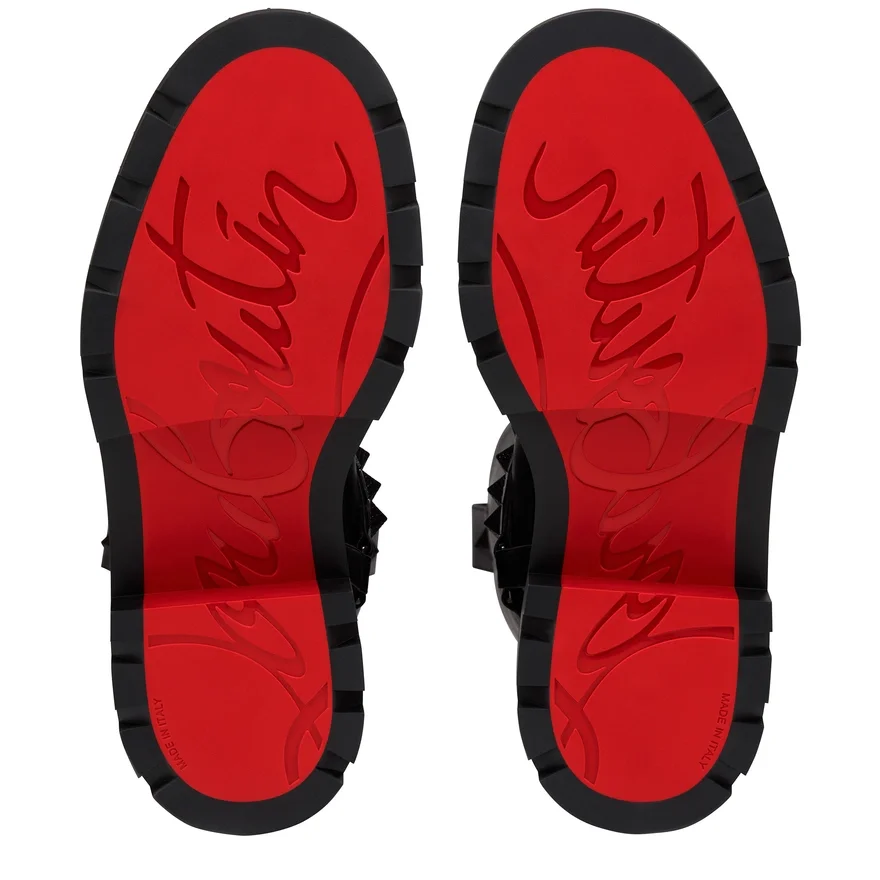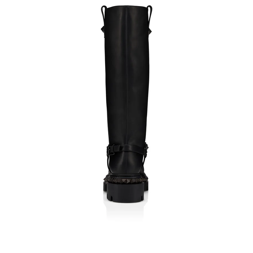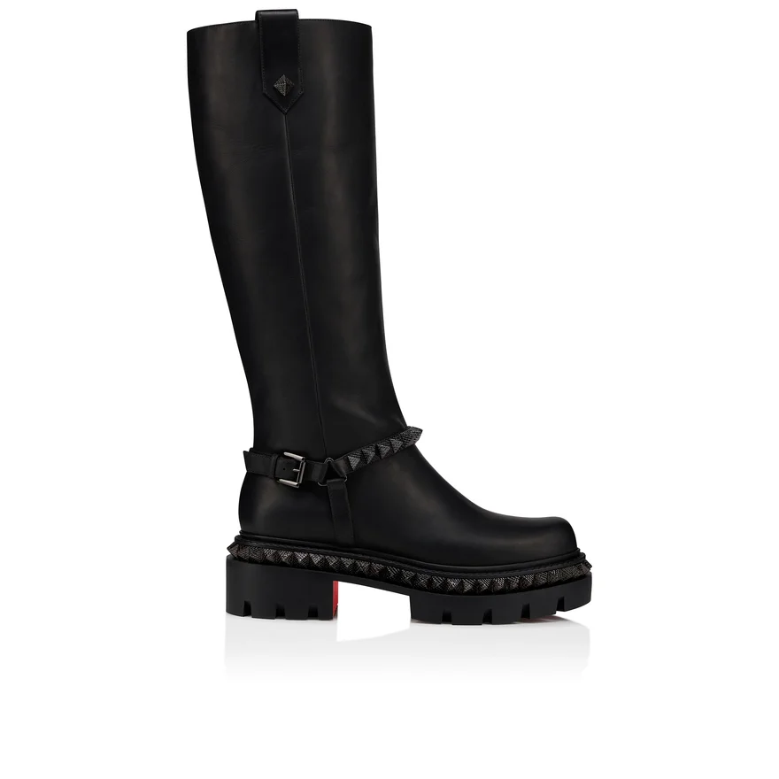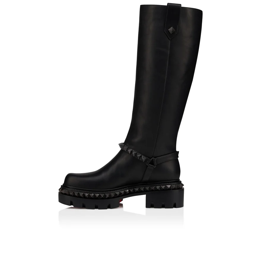 With Its Urban Lines, the Marinetta Pyraclou Boot is Set on a Notched Sole. Featuring a Square Toe, It Wraps the Leg with Its Tubular Silhouette Made Entirely from Black Waxed Calf Leather. It Features a Strap Around the Ankle and Tonal Spikes in the Shape of a Pyramid Around the Sole and on the Strap, a Signature Detail from Maison Christian Louboutin.