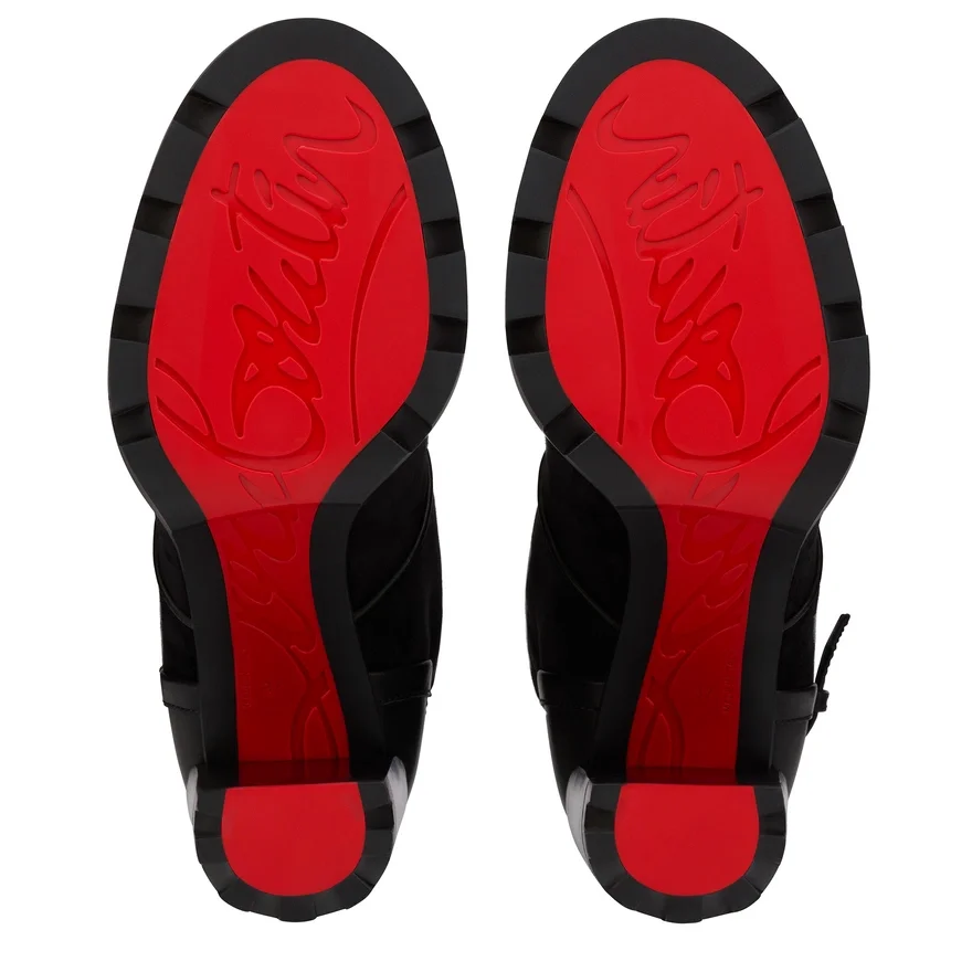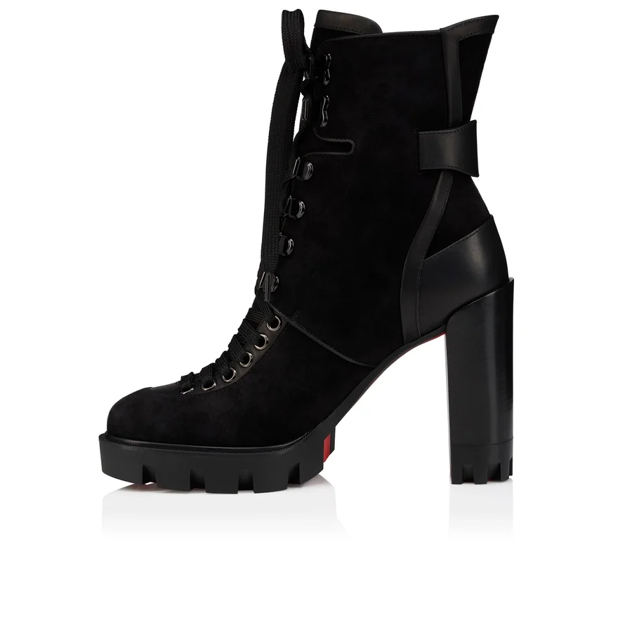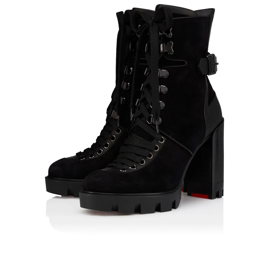 The New Macademia Platform Ankle Boot Has a Modern, Audacious Appeal. Set on a 100 Mm Block Heel and a Notched Rubber Sole, This Maison Christian Louboutin Model is Crafted in Black Veau Velours and Waxed Calf Leather. Tonal Loops and an Adjustable Strap Adorned with a Metal Buckle Make the Shoe Stand Out.