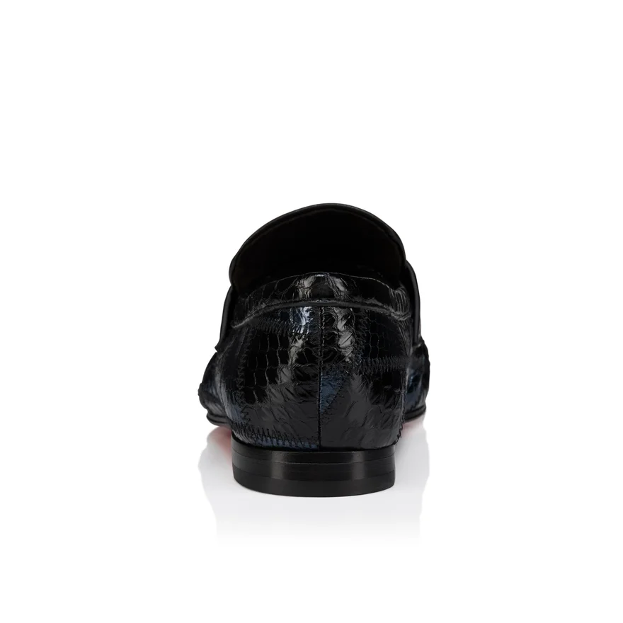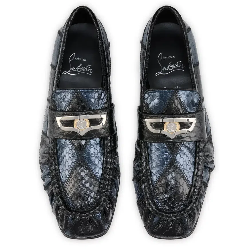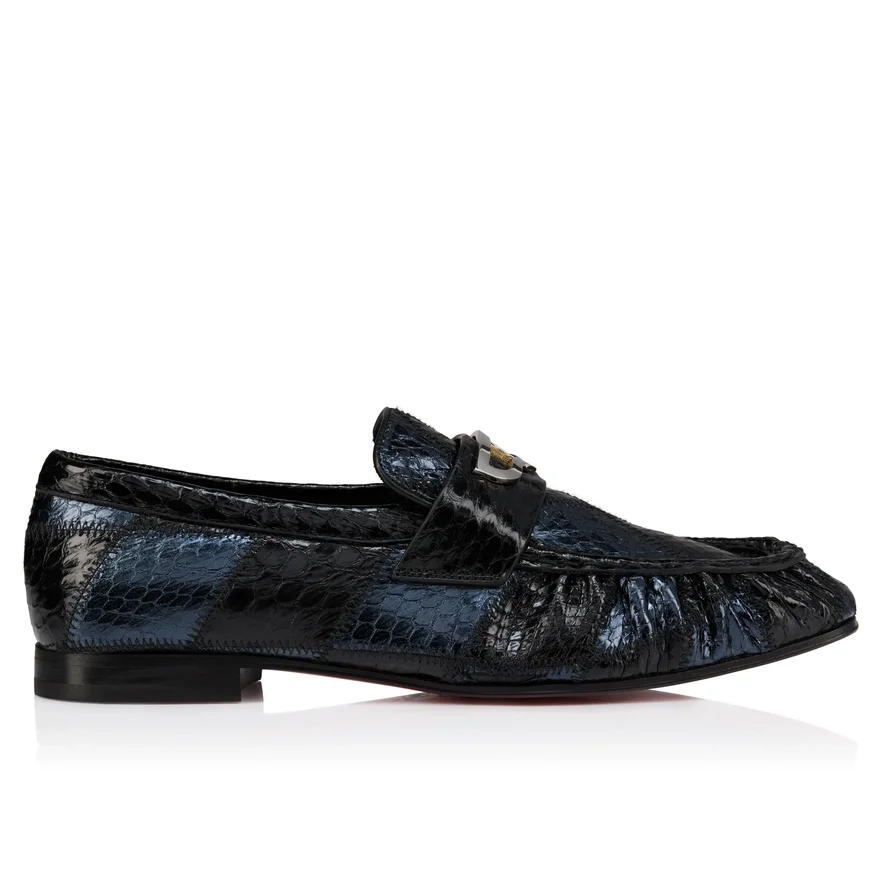 The Mocallista Loafer Has a Refined Design. Crafted in Watersnake Leather with a Black and Last Night Blue Patchwork in a Diamond Pattern, This Maison Christian Louboutin Model Features a Tongue Adorned with a Silver Bar That Holds a Coin Stamped with the Maison Logo, and is Defined by Its Pleated Detailing at the Front.
