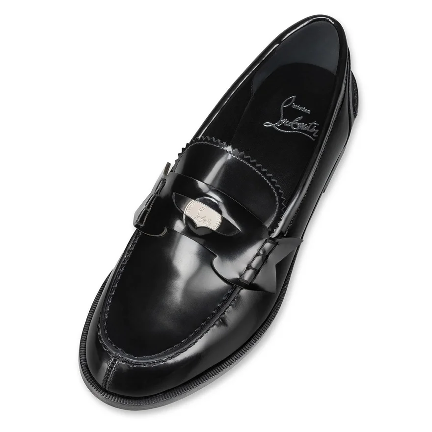 A New Twist on the Penny Loafer, Complete with a Coin Slot, the Penny Enchants with Elegant Appeal. This Maison Christian Louboutin Model is Crafted in Black Calf Leather and Features a Notched Tongue. It is Enhanced with a Strap over the Upper and Outlined with Visible Topstitching for a Graphic Look.