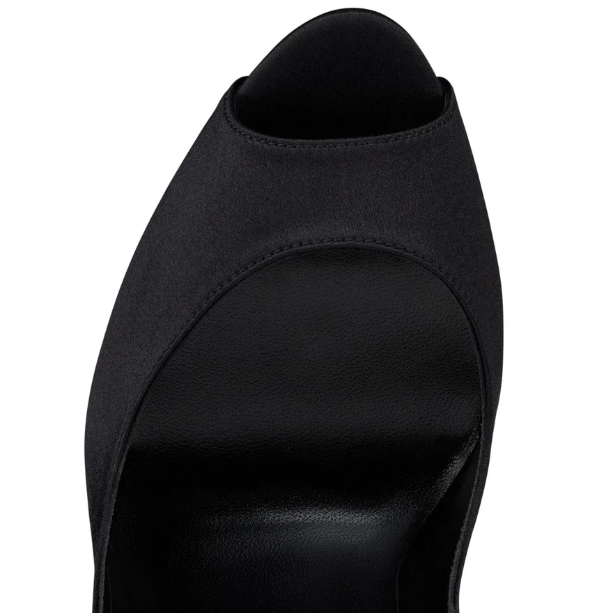 An Iconic Model, the Lady Peep Seduces with Its Sculptural Audacity. In Black Crepe Satin, It is Mounted on a Platform and 150Mm Stiletto Embellished with Strass. Its Scooped Lines Reveal with Finesse a Vertiginous Arch. Each Step Attests to the Savoir-Faire of the Louboutin House While Echoing the Elegance of the Film Industry.