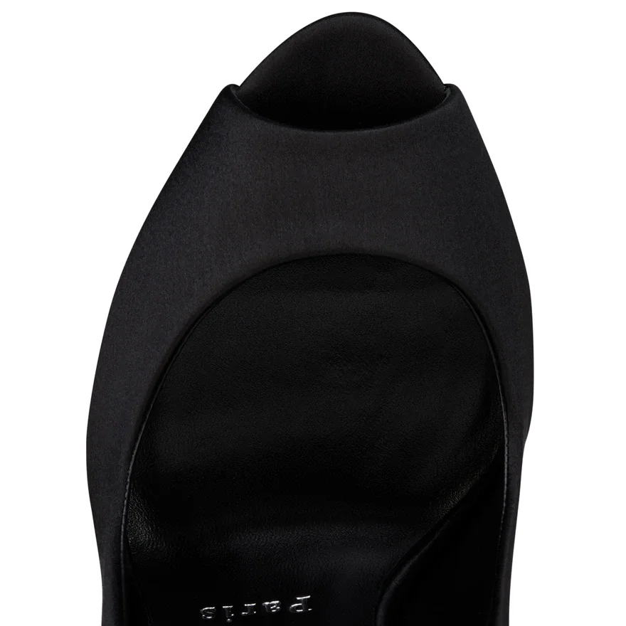 An Audacious Platform Pump, the Maison Christian Louboutin Lady Z Suola Strass Reveals the Foot with a Plunging Vamp and Features a Padded Insole and Discreet Platform for Added Comfort. Made Entirely from Black Crepe Satin, It Features an Open Toe and Delicate Finishes. This Sophisticated Model is Set on a 120 Mm Stiletto Heel Revealing the Iconic Red Sole Covered in Red Strass. This Shoe is Part of the Hollywood Capsule.