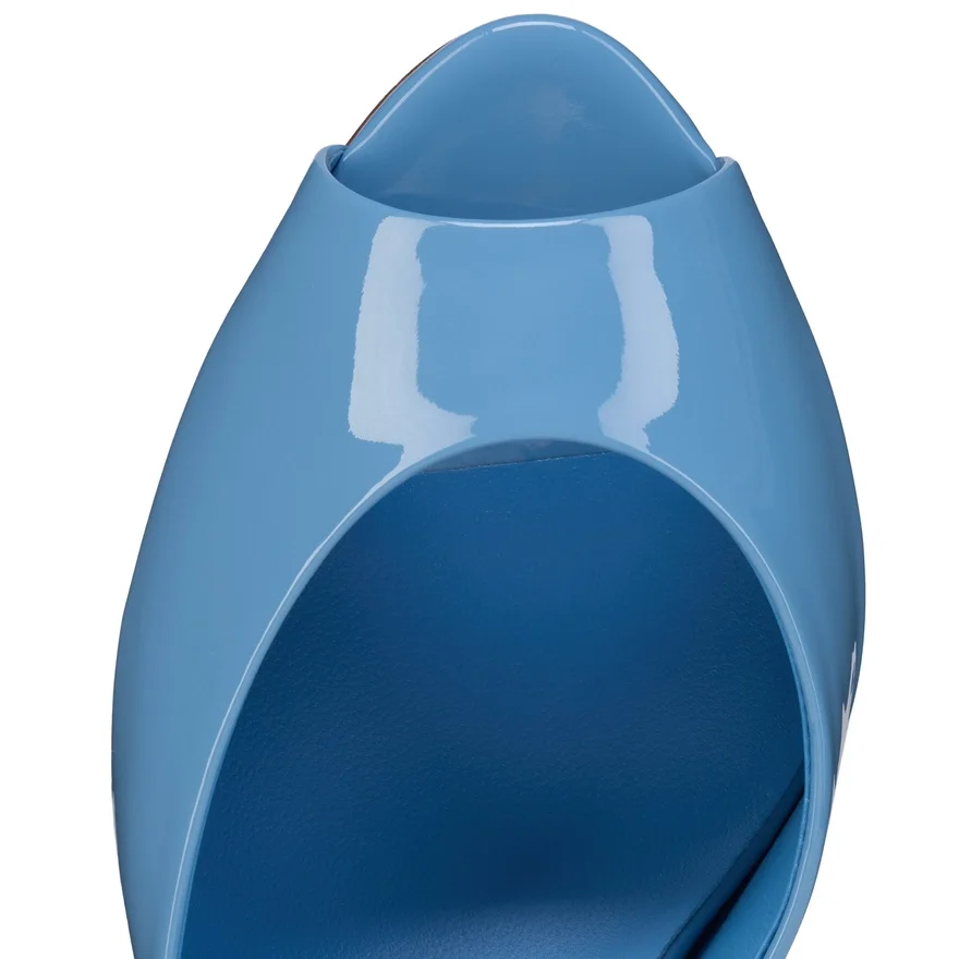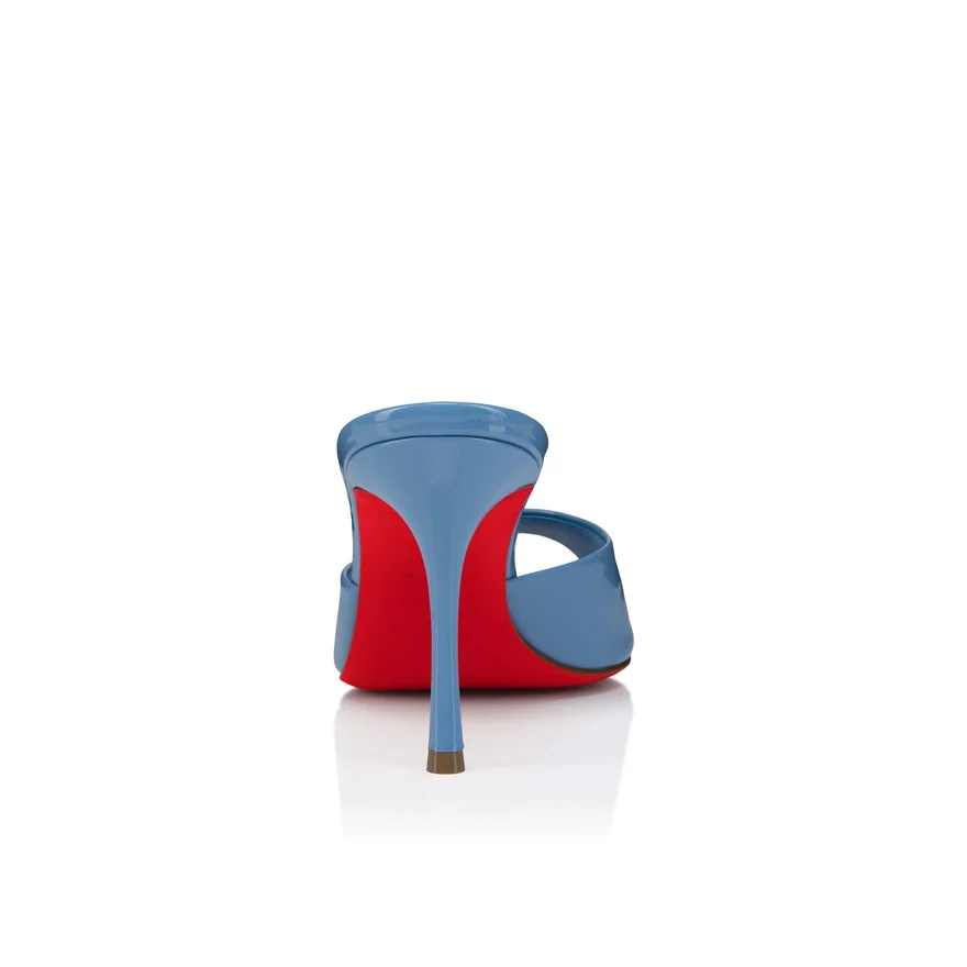 Maison Christian Louboutin’s Me Dolly Mule Features a Peep-Toe, Pronounced Arch, and Low-Cut Vamp. This Audacious, Retro-Style Sandal Displays Glamourous Curves and a 85 Mm Stiletto Heel Revealing a Glimpse of Loubi Red. It is Crafted from Ceruleo Blue Patent Calf Leather for a Distinctive, Glossy Appeal.