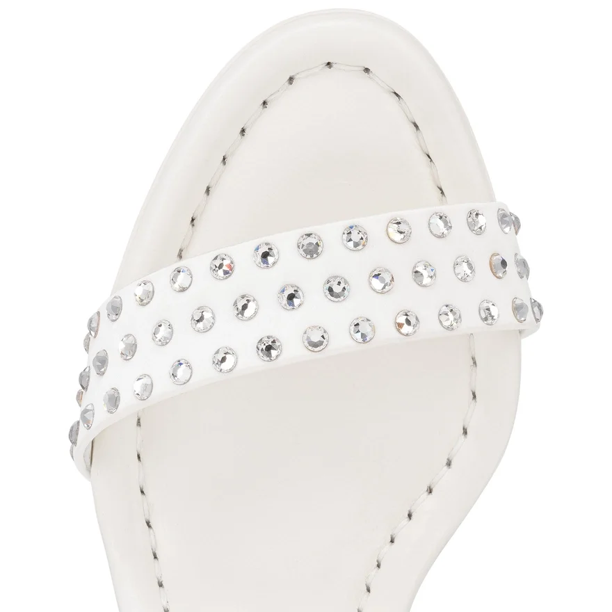 The Missjane Sandal Strass Boum is Distinguished by a Square, Bevelled 85 Mm Heel Andpadded Insole. Made Entirely from White Crepe Satin, This Maison Christianlouboutin Model is Embellished with Hand-Applied Strass. The Slim, Slenderstrap Elegantly Wraps Around the Top of the Foot, While the Ankle Isaccentuated by a Strap with a Small Metal Clasp. This Wedding Collection Modelfeatures the Christian Louboutin Logo and Heart Stamp on the Insole.