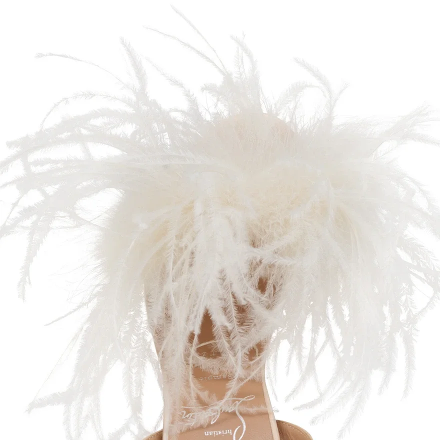 A Testament to Maison Christian Louboutin’s Savoir Faire, the Miss Z Poupi Sandal Enchants with Its Audacious Lines and Its Padded Insole. Set on a 100 Mm Stiletto Heel, This Shoe is Made from Blush Beige Crepe Satin. It Has a Delicate Ankle Strap and is Defined by Tonal Feathers for a Sophisticated Style. This Model Features an ‘Everlasting Red’ Sole Thanks to an Innovative Coating Technique to Ensure Resistance and Lasting Vibrancy for Our Signature Louboutin Red.