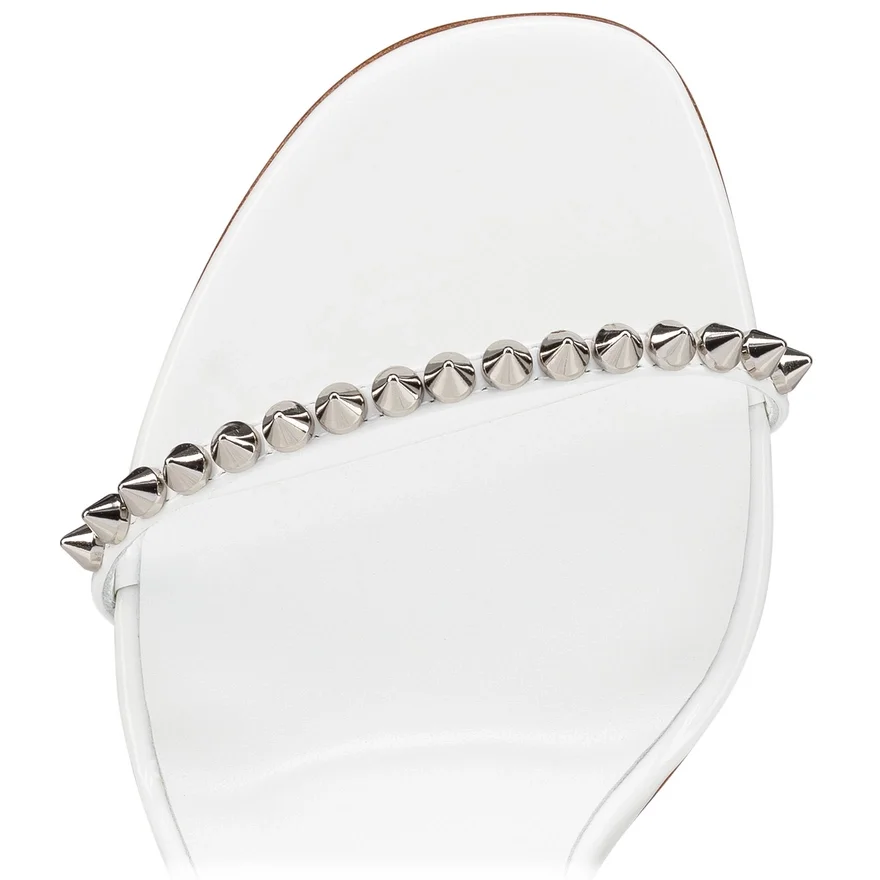 Inspired by the Iconic Loubi Queen Stiletto, the Powerful So Me Sandal by Maison Christian Louboutin Cuts a Striking Silhouette with Signature Glossy Tonal Spikes Adorning the Toe and Heel Straps, an Elegant Pronounced Arch, and a Delicate 100 Mm Heel. This Model is Crafted in All-Over Bianco White, Showcasing Patent Leather and a Tonal Lining.
