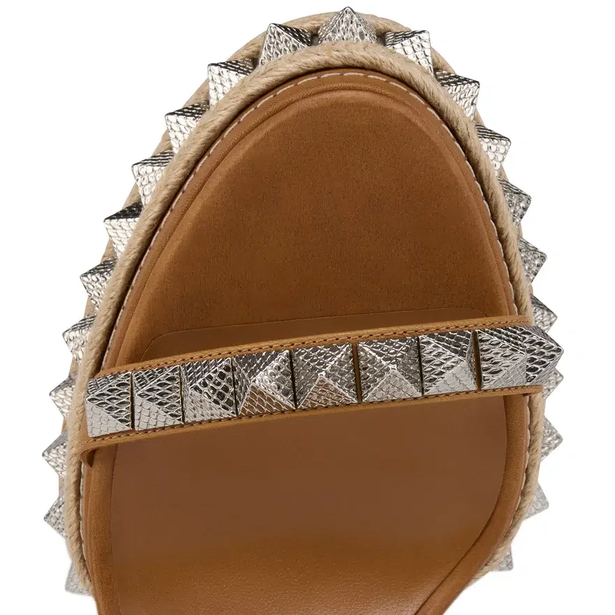 Dare to Be Different in the Superaclou 130 Mm Block Heel Sandal. Crafted from Terra Brown Calf Leather, the Toe and Ankle Straps Are Adorned with Pyramid-Shaped Contemporary Spikes That Are Also Encased with Decorative Braided Rope on the Heel and Sole. The Iconic Maison Christian Louboutin Loubi Red Sole Adds the Finishing Touch to This Sandal to Be Seen In.